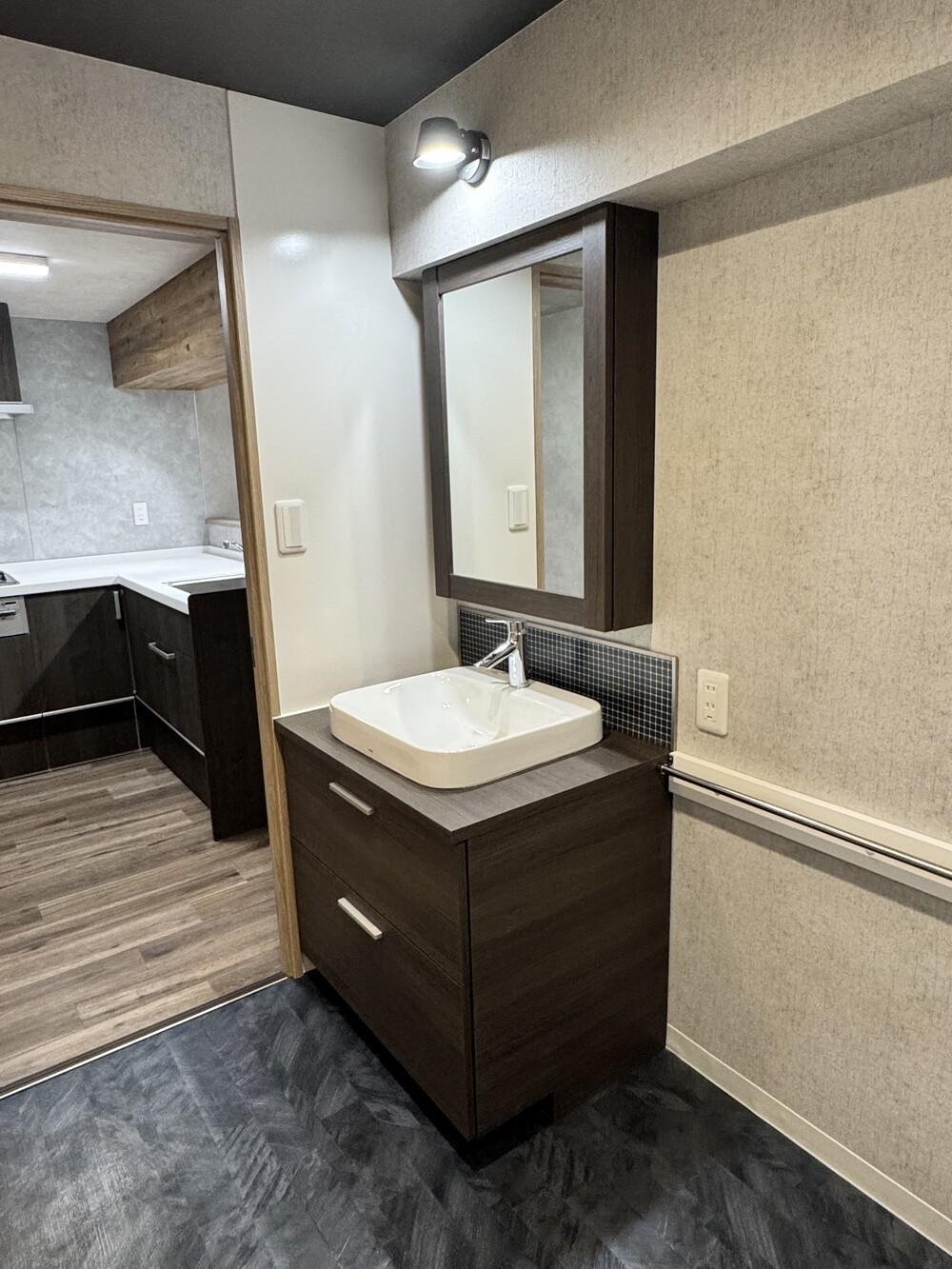 キッチンを含めた水回りをダークブラウンで合わせる事で統一感が出ました。