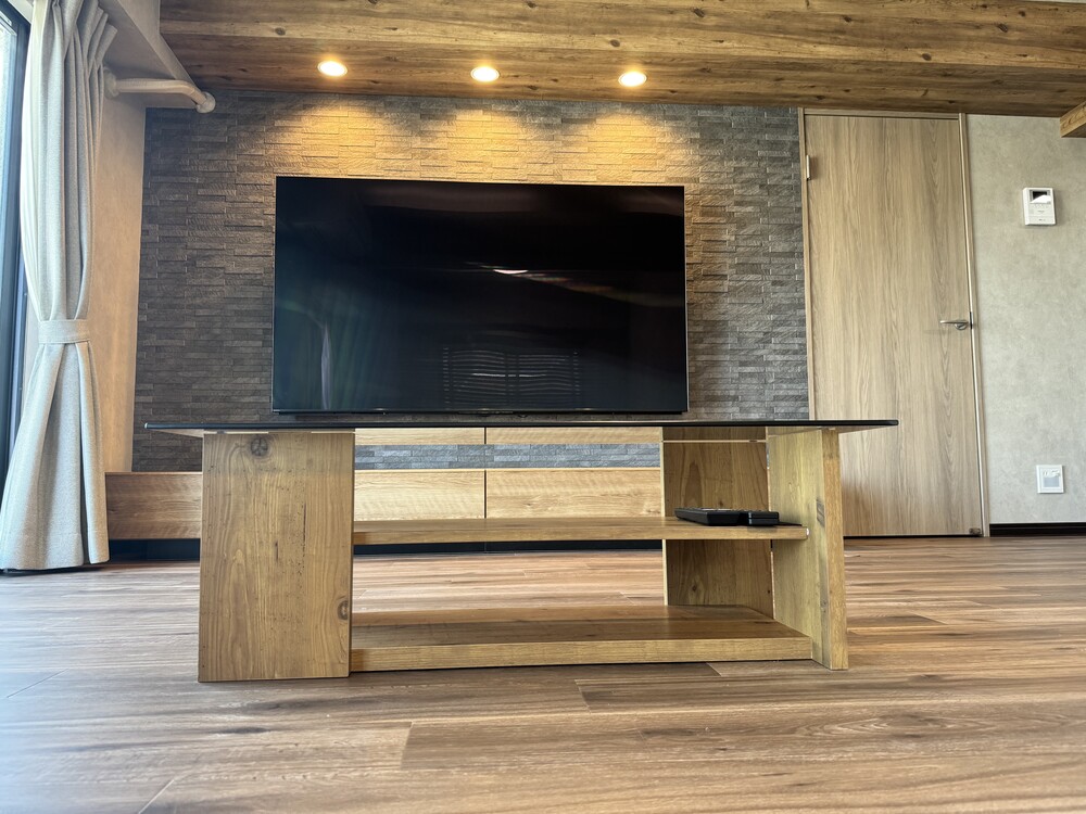 テレビを主役にしたダウン照明に、モノトーンのエコカラットと梁の木目調のアクセントでナチュラルモダンな落ち着いた雰囲気に。