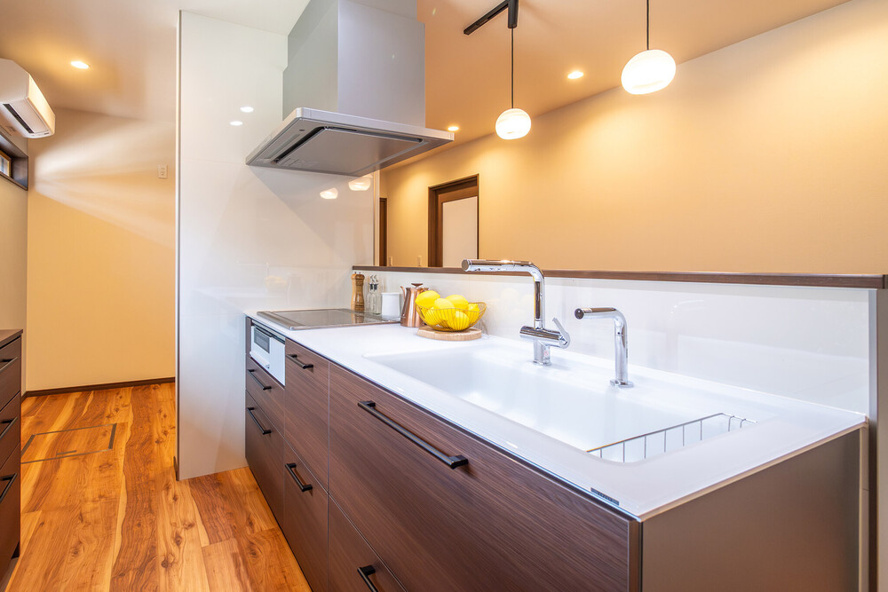 扉カラーの「アコールダークウッド」と床材「ダイケン イエリア(ラスティックブラウン)」が、純和風の建物に馴染む落ち着いた空間を演出。