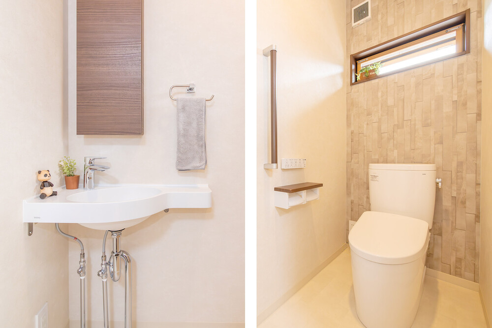 出入り口と便器横の2箇所に手すりを設置し、将来の介助も見据えたゆとりある広さを確保しました。