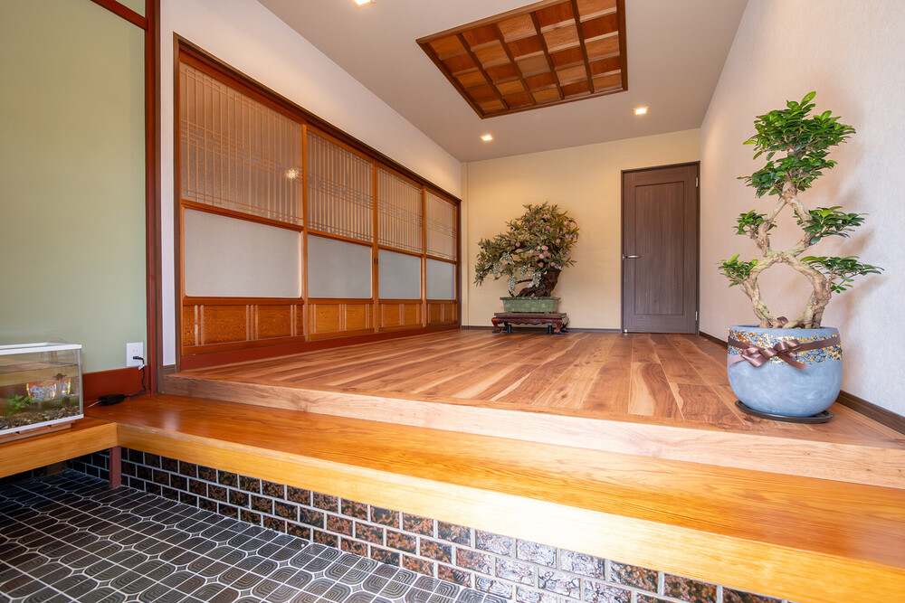 靴脱ぎ場の周囲は「じゅらく壁」で仕上げ、格天井に調和する純和風の質感を演出。また、長年親しまれている金魚の水槽のために最適な位置へコンセントを新設するなど、今の暮らしの楽しみを損なわない工夫を凝らしています。