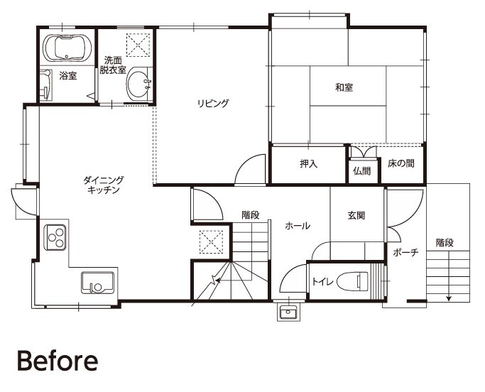 以前の間取りだと、外から帰ってきて手を洗う、お風呂に入るまでにリビング、ダイニングを通らないといけなかったため、外から持ち帰った菌や花粉が家族が集まるリビングにまかれているのではと気になっていたお施主様。冬に寒かったお風呂を取替するだけでなく、位置も移動。玄関側に浴室、洗面、トイレをもってくることで、帰宅してきれいにしてからリビングでくつろげる間取りになった。