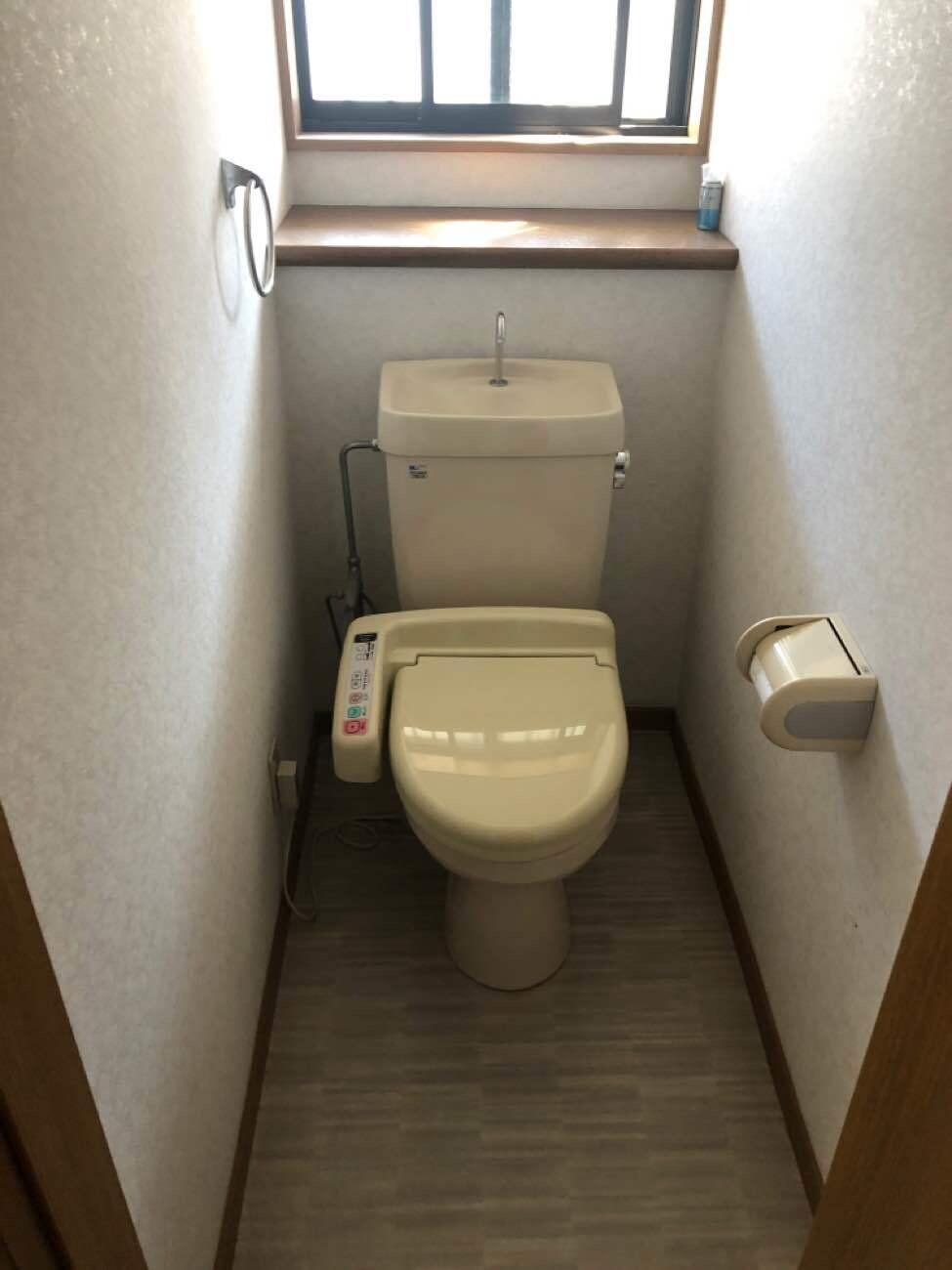 階段下に移動したトイレ。好きな木目のクロスを貼った。カウンター収納を設置し、床に物を置かないことでお掃除しやすくした。