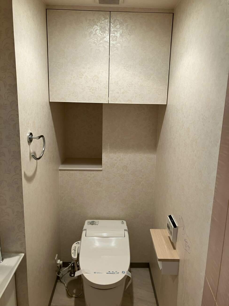 トイレにあった手洗い器は洗面所で手を洗うので不要とのことで撤去。物の少ないご夫婦には吊り戸も不要。奥のへこんでいるスペーズは収納に活用。扉を付け、目立たせないようにクロス貼りのプッシュ式にした。壁1面と天井を落ち着いた色に、お施主様が購入したトイレットペーパーホルダーと色味を合わせた。