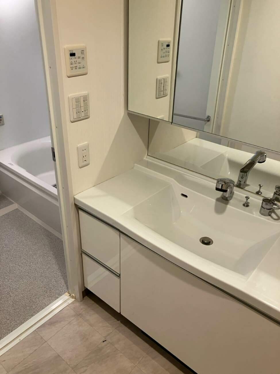 白×グレーのシンプルなお風呂。鏡や棚は一切なし。シンプルに掃除しやすく。