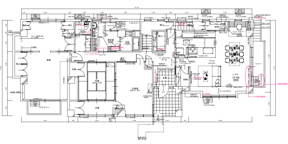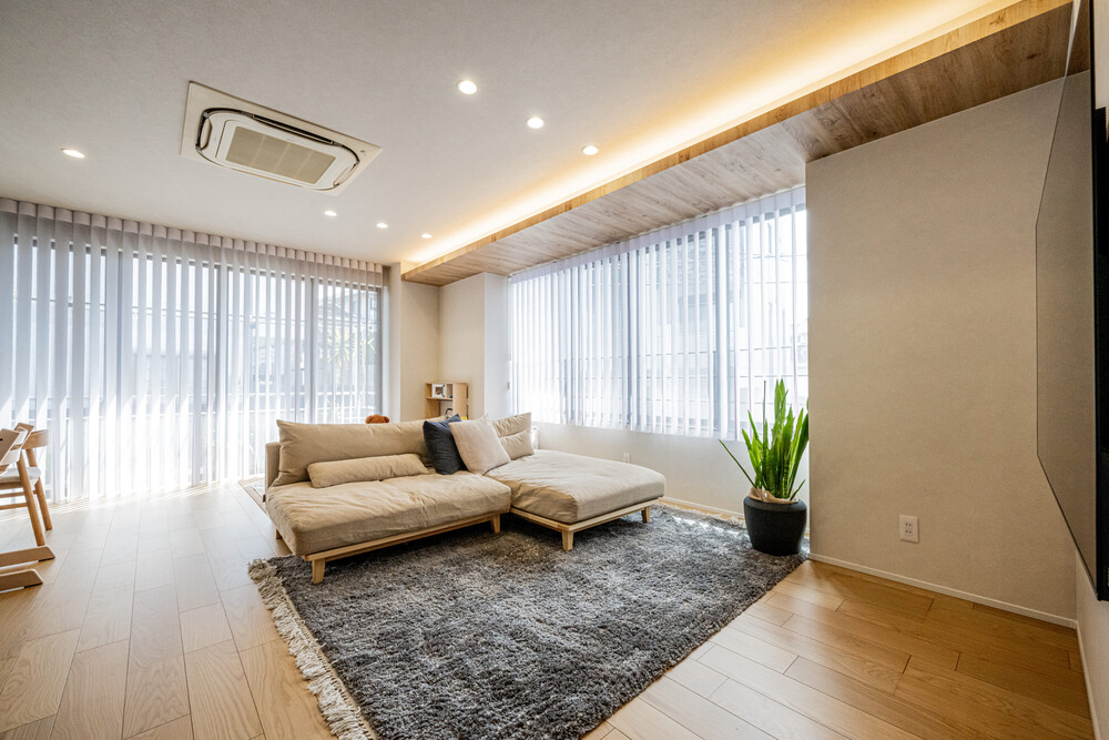 ①居心地の良いLDKの実現: ご家族の団らんの中心となるリビング・ダイニング・キッチンを中心に設計。自然と人が集まり、会話が弾むように間接照明や温かみのある素材を空間に取り入れました。また、お子様の遊ぶスペースをキッチンから見える箇所に設置しました。