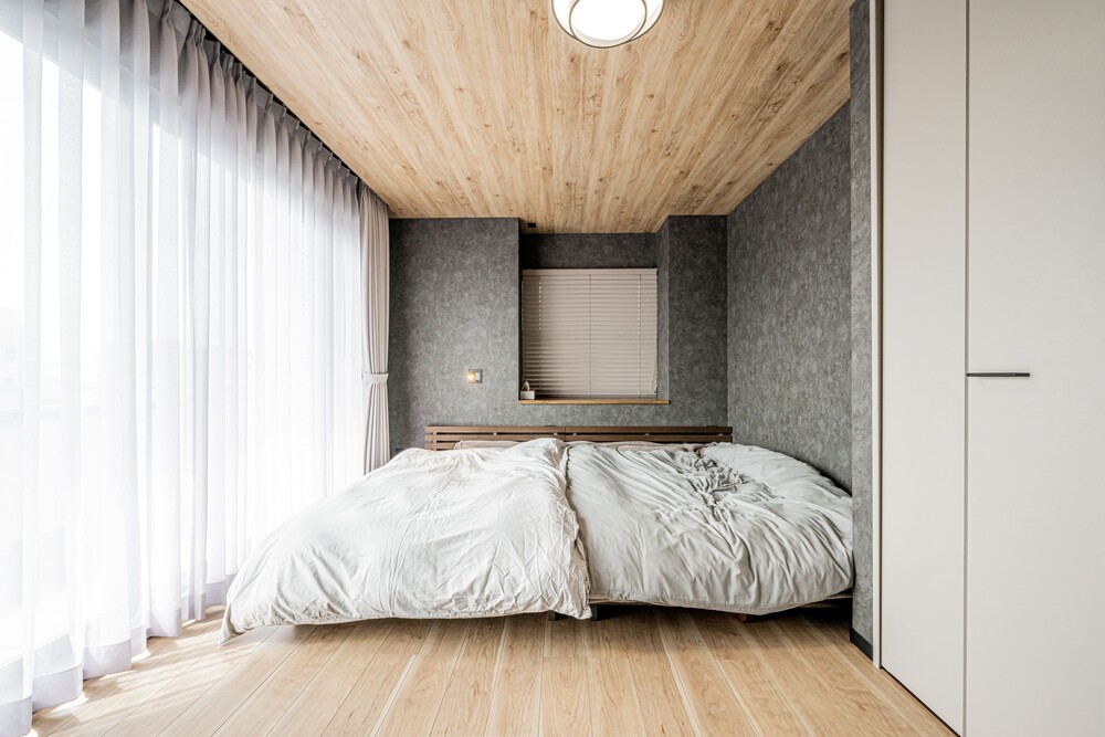 カーテンボックスでレールを隠し、木目天井やグレーの壁紙が映える空間となりました。