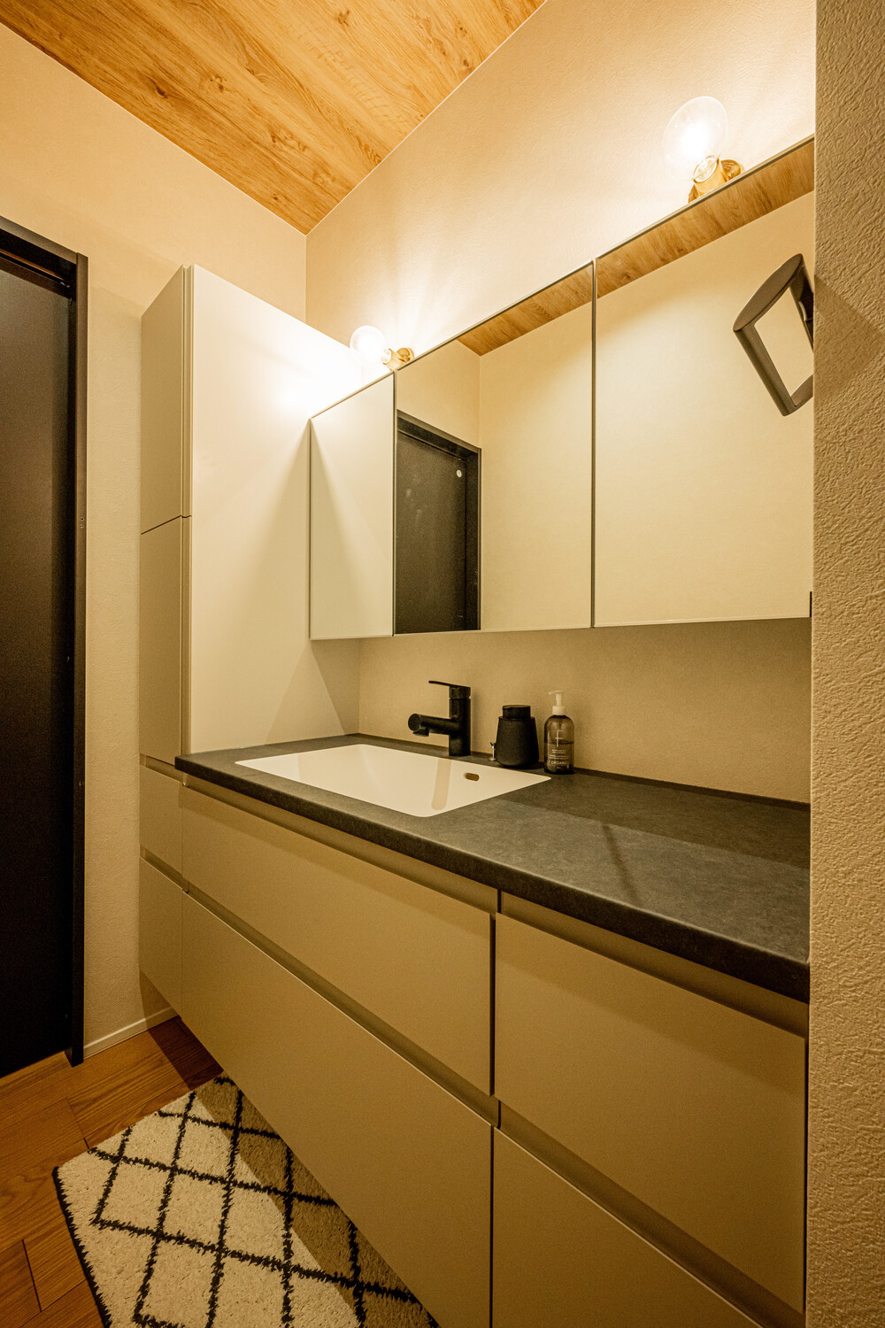 足元を浮かせたフロートデザインの洗面が広がりを感じさせる一方、トール収納を備えることで、美しさと高い収納力を両立させました。