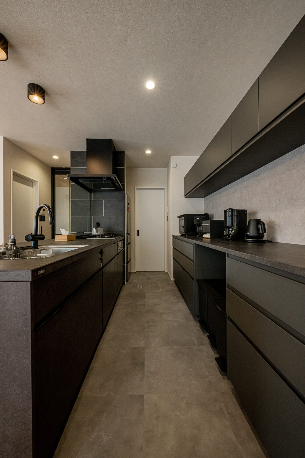 キッチン、ダイニング、リビングが直線的につながったLDKは、どこにいても家族の気配を感じられ、大人数で集まる機会も大切にできる設計です。パントリーや壁面収納により、生活感を抑えつつ、増えがちな荷物をすっきり収納できます。また、キッチンから水回りへのコンパクトな家事動線により、家事の同時進行がスムーズです