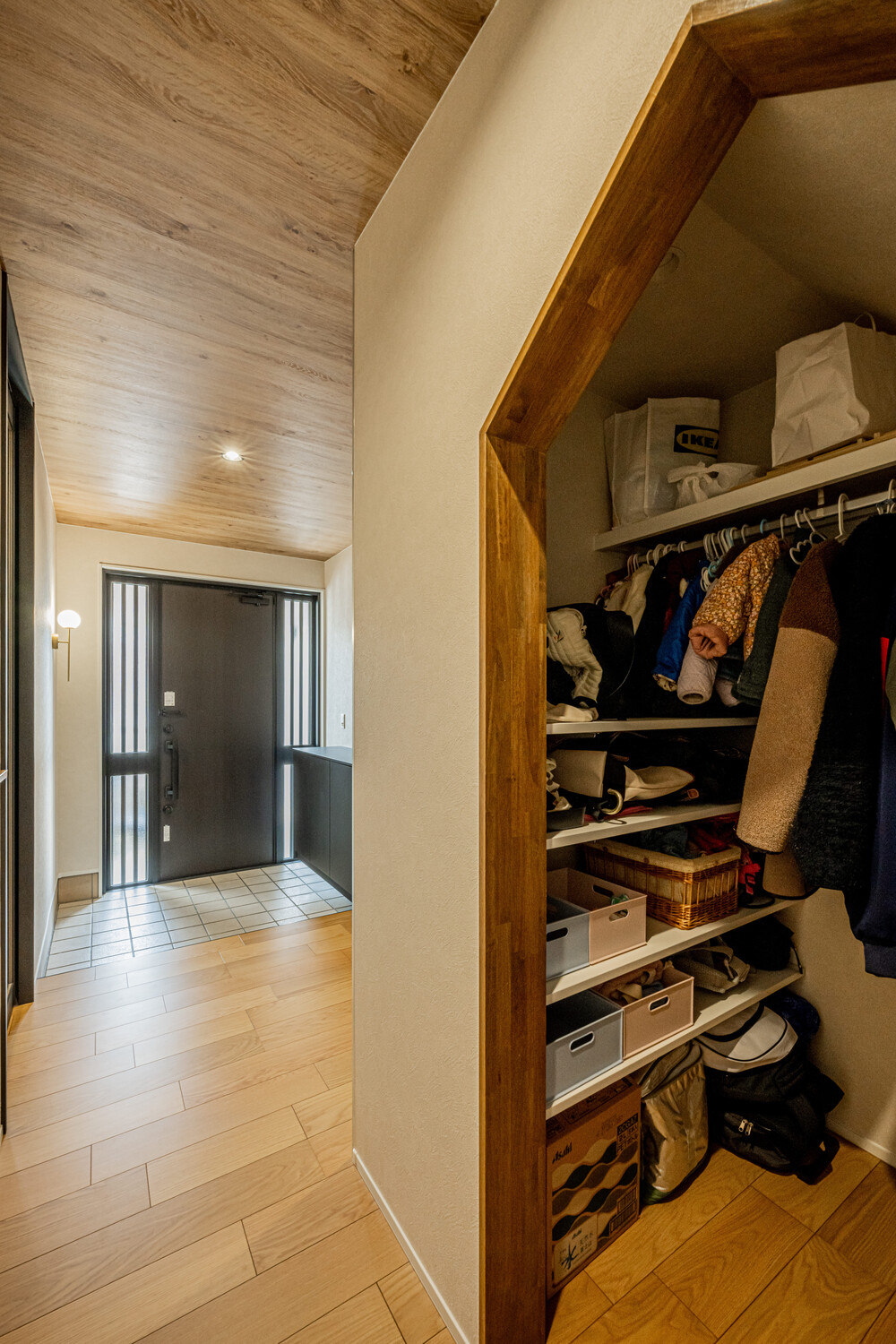 玄関からすぐにある物入は、帰宅後すぐに上着をかけたり、外用品などを収納したりすることができます。
