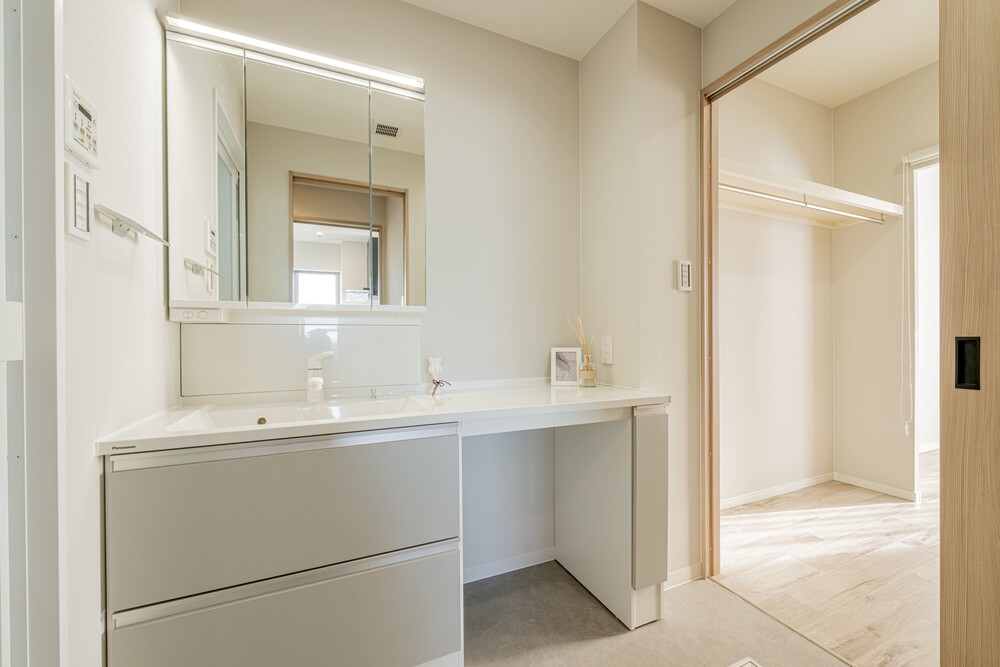 ①広々とした洗面脱衣室の確保: 既存の間取りから洗面室のスペースを広げ、洗面台を大きなサイズにすることで、作業もできるようにしています。また、洗面室からWIC、バルコニーまでの動線も簡潔にすることで手間を軽減しています。洋室3にはハンガーパイプを取り付け、雨の日も洗濯物を干すことができます。