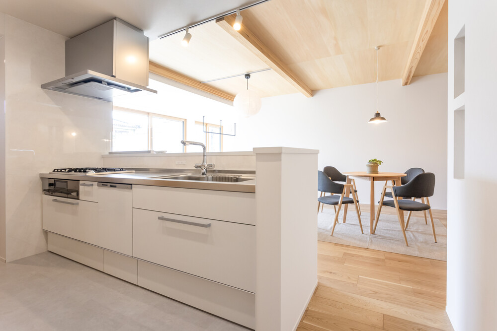 キッチンはLDK全体を見渡せる配置とし、土間スペースまで視線が届く設計に。家事をしながらお子様の様子を見守れる安心感を確保しました。動線を短縮することで日々の家事負担を軽減。素材や色味をLDKと統一し、空間全体に一体感を持たせています。