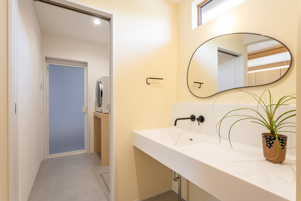 洗面空間にはやわらかな印象を与えるイエローの壁を取り入れ、明るく温かみのある雰囲気に仕上げました。必要な収納を確保しながら動線を整理することで、使いやすさを向上。日常的に使用頻度の高い空間だからこそ、清潔感と機能性を重視した設計としています。