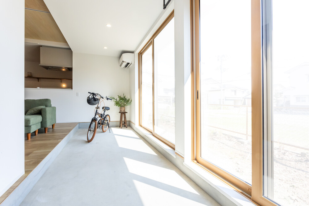 室内に設けた土間スペースは、中庭のような開放感を持ちながら、天候に左右されず活用できる半屋外的空間です。お子様の遊び場や趣味スペースとして活用でき、メンテナンス性にも配慮しました。デザイン性だけでなく、子育て世帯の実用性にも配慮した計画です。
