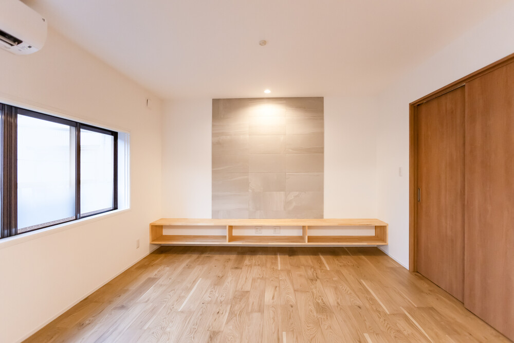 壁面にエコカラットを採用し、意匠性と調湿効果を兼ね備えた空間へ改修しました。収納も確保し、落ち着いて過ごせるプライベート空間として整えています。