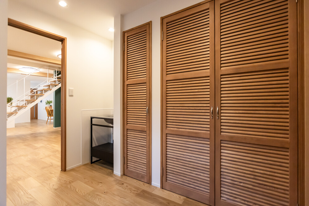 動線を整理し、建具職人に依頼したオリジナルの玄関収納を設置。空間寸法に合わせて造作することで収納力を確保し、統一感のある仕上がりとしました。あわせて手洗い場を設け、帰宅後すぐに使える衛生動線を確保。機能性と実用性を高めた玄関空間へ改修しています。