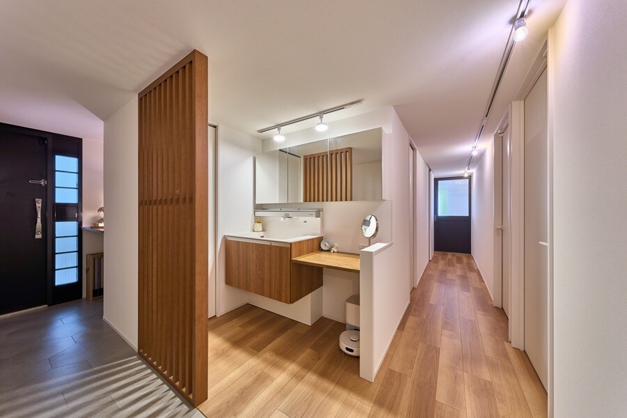 洗面スペースは、玄関を入り、半間仕切り的な格子状の壁
