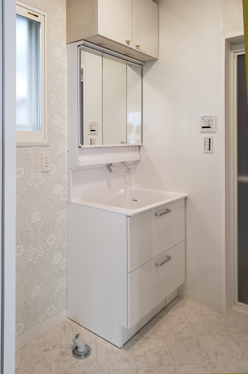 これにより、日用品を洗面台内部に収めることが可能となり、視覚的にもすっきりとした洗面空間を維持できます。また、既存の上置き収納棚を再利用することで廃棄物の削減に配慮し、住まいへの愛着を継承するリフォームです。