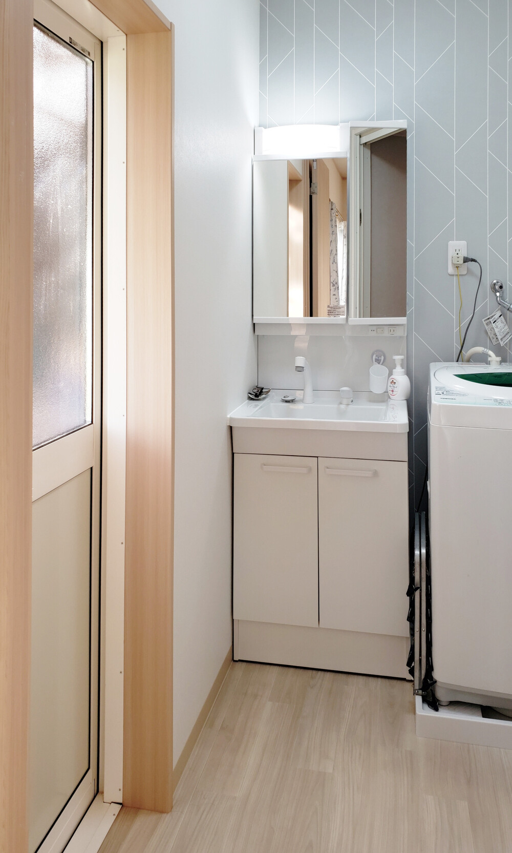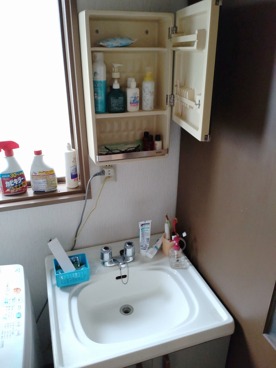 収納不足により洗面ボウル上に物を置かざるを得ない状況であったため、収納力を備えた洗面化粧台へ交換しました。費用を抑えつつ収納性を確保できる TOTOの「Vシリーズ」を採用しました。三面鏡裏の収納スペースも活用することで、整理整頓しやすくすっきりとした洗面空間になりました。
