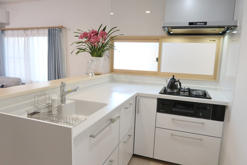 ➂通常の家事及び来客時の動線をスムーズにするため、L型対面式キッチンへレイアウトを変更しました。