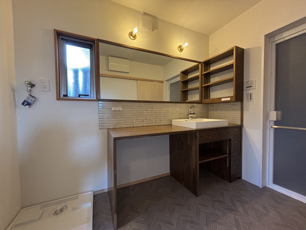 狭かった洗面脱衣室は使わないエリアを解体してより大きなスペースを確保。水が跳ねるところにはタイルを貼ってアクセントをつけました。