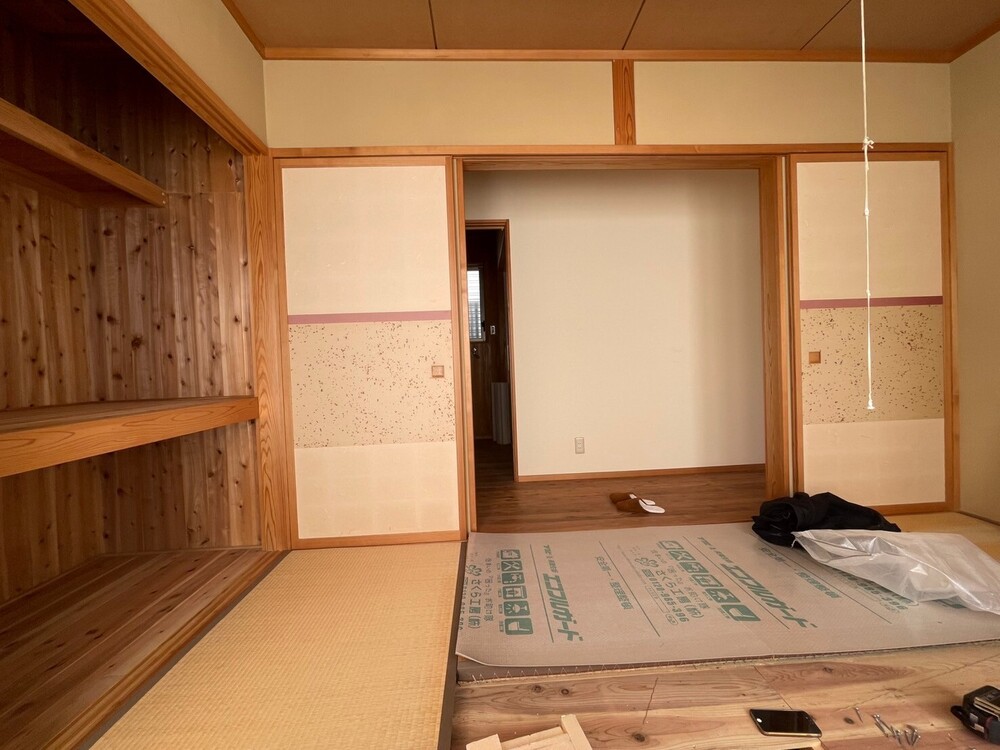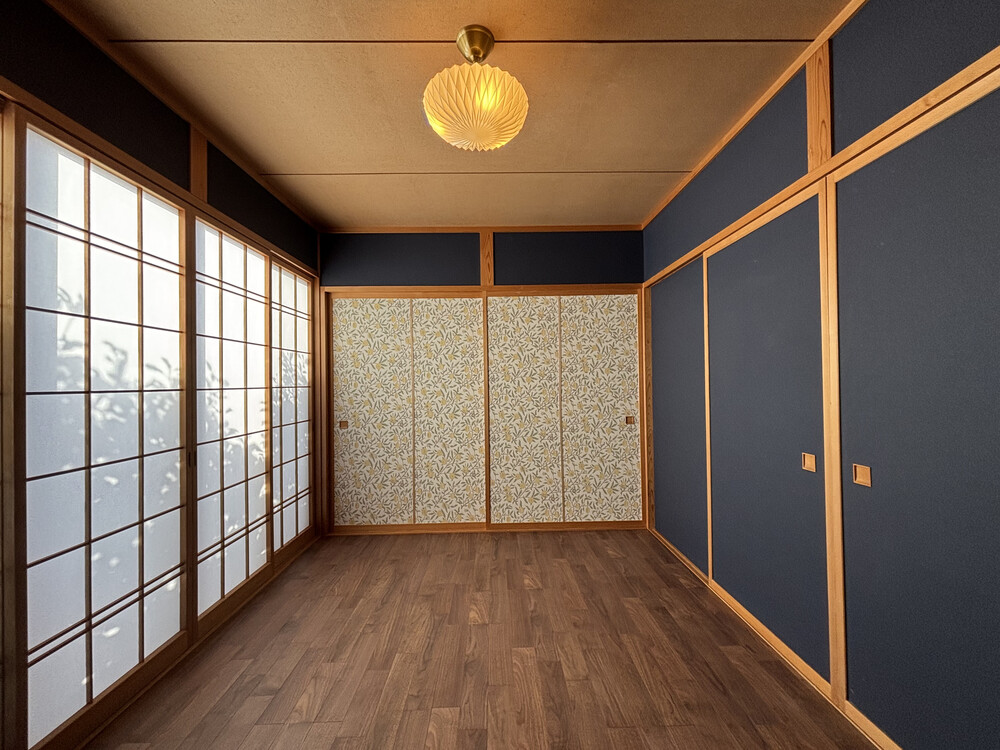 落ち着いた雰囲気の和室でしたが、敢えて壁紙の色を大胆な濃色に。襖は華やかな柄を用いて遊びを出してみました。