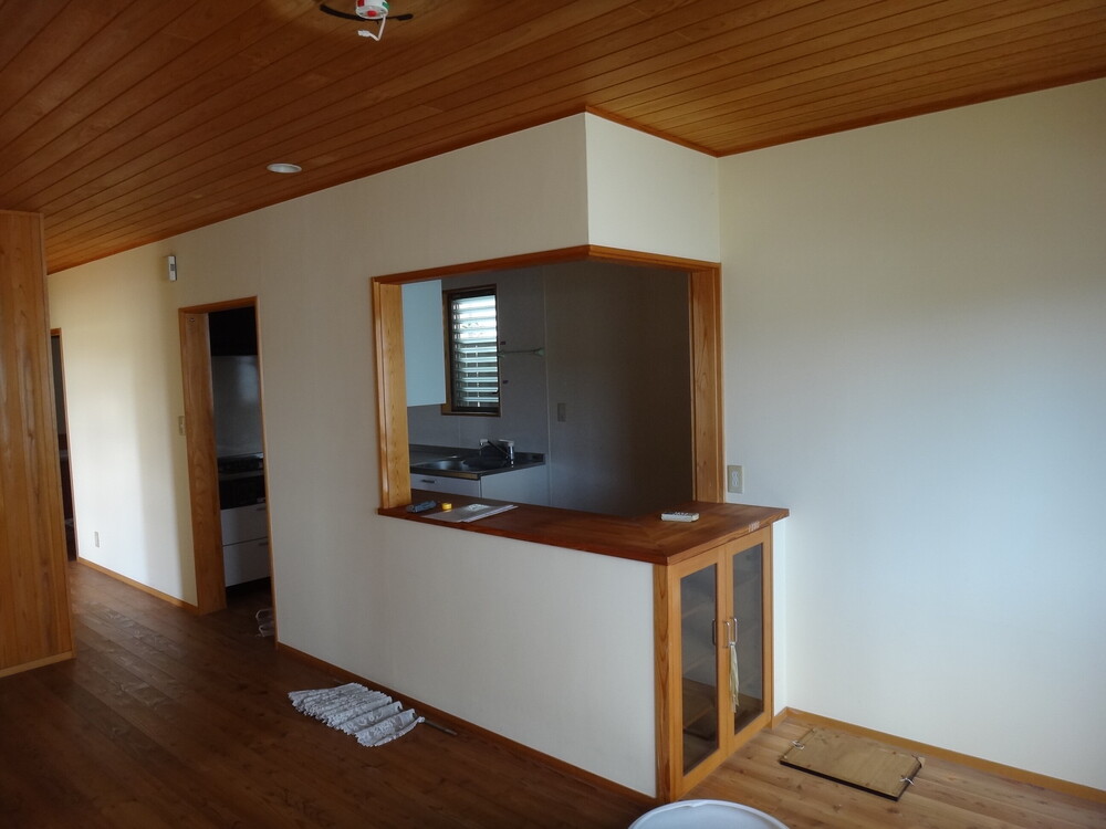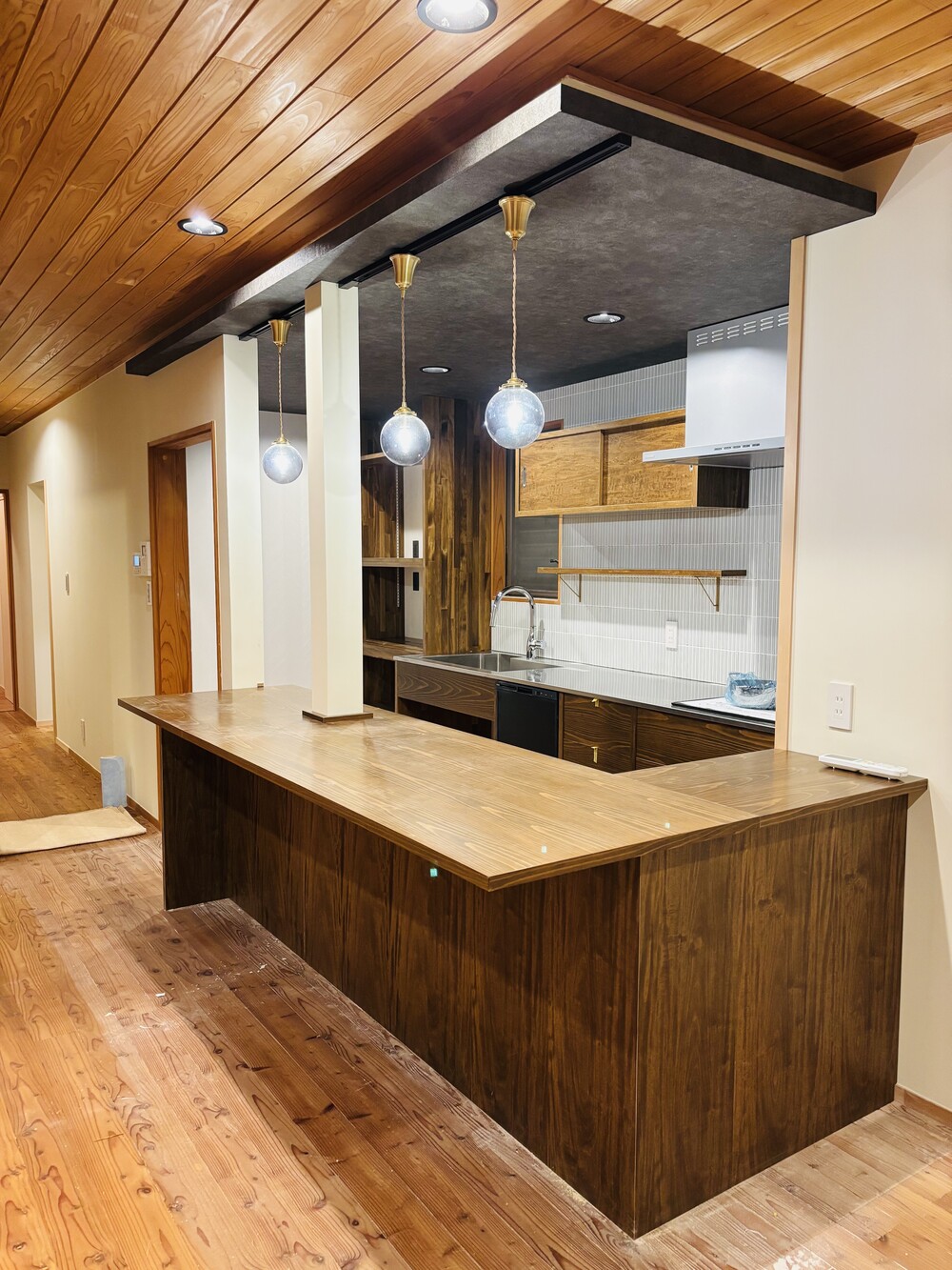 既存無垢材の床や天井を生かしつつ造作キッチンや洗面台を設置することで統一感のあるデザイン、色調に仕上げました。