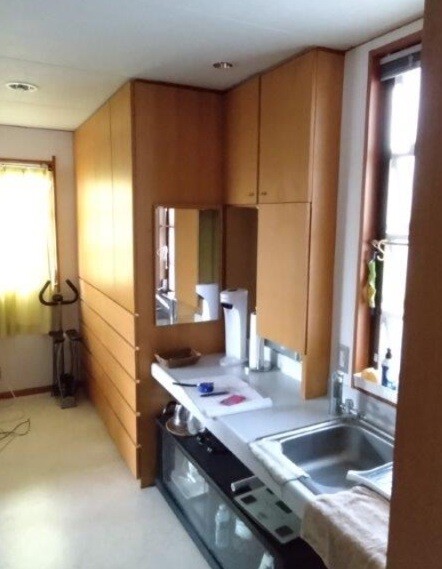 かつてのキッチンは落ち着きのある木目と赤いキッチンでしたが、独立キッチンゆえに光が届きにく三世帯で使われるには手狭な感じがありました