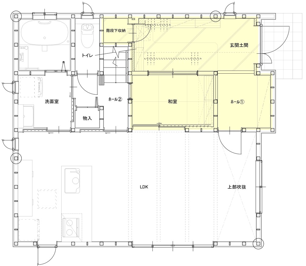 和室縮小による狭さを感じさせない工夫として、和室と玄関土間の堺にガラス戸の設置をご提案。