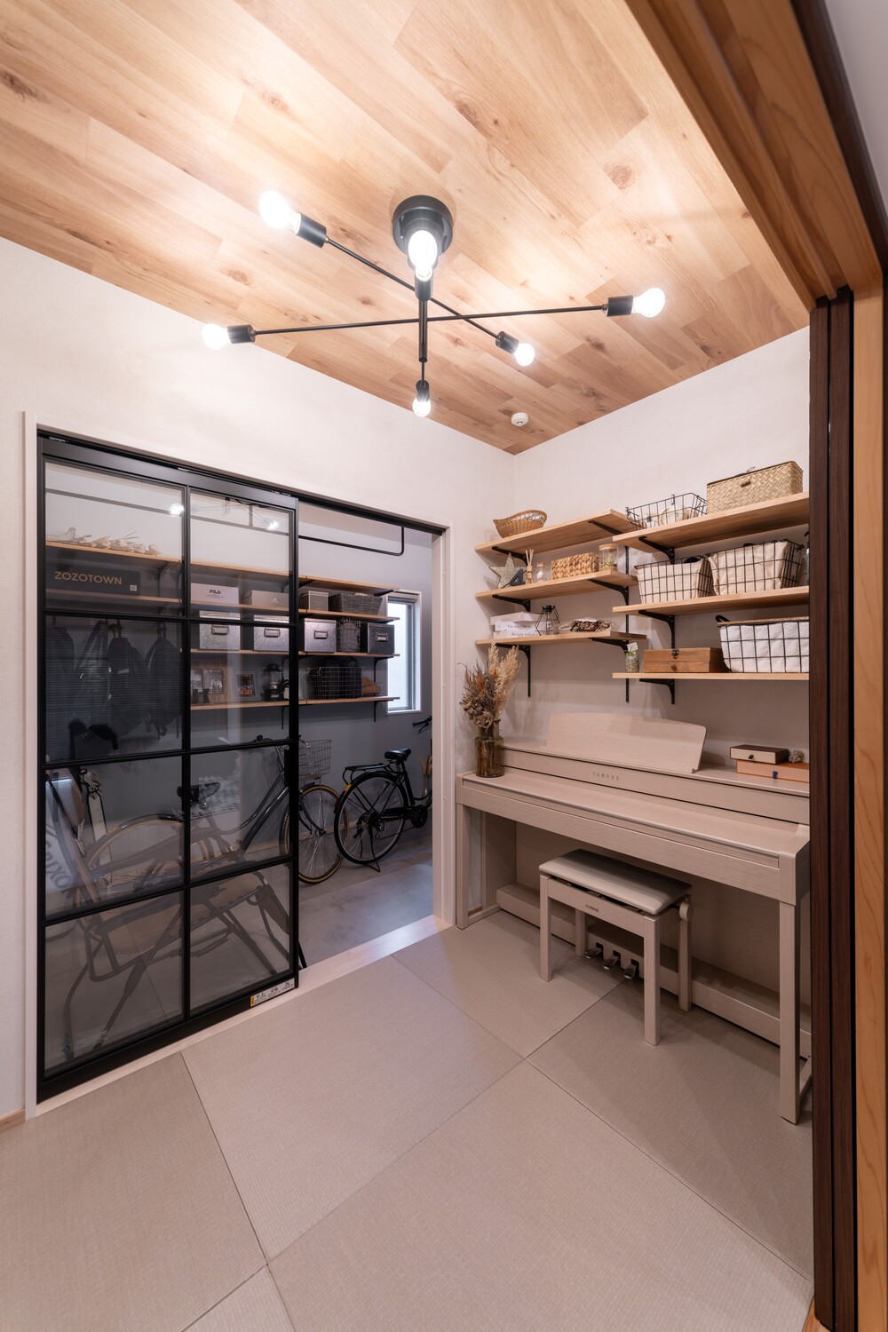 和室スペースは最低限に残し、キャンプグッズは収納のしやすさを重視して可動棚をご提案。