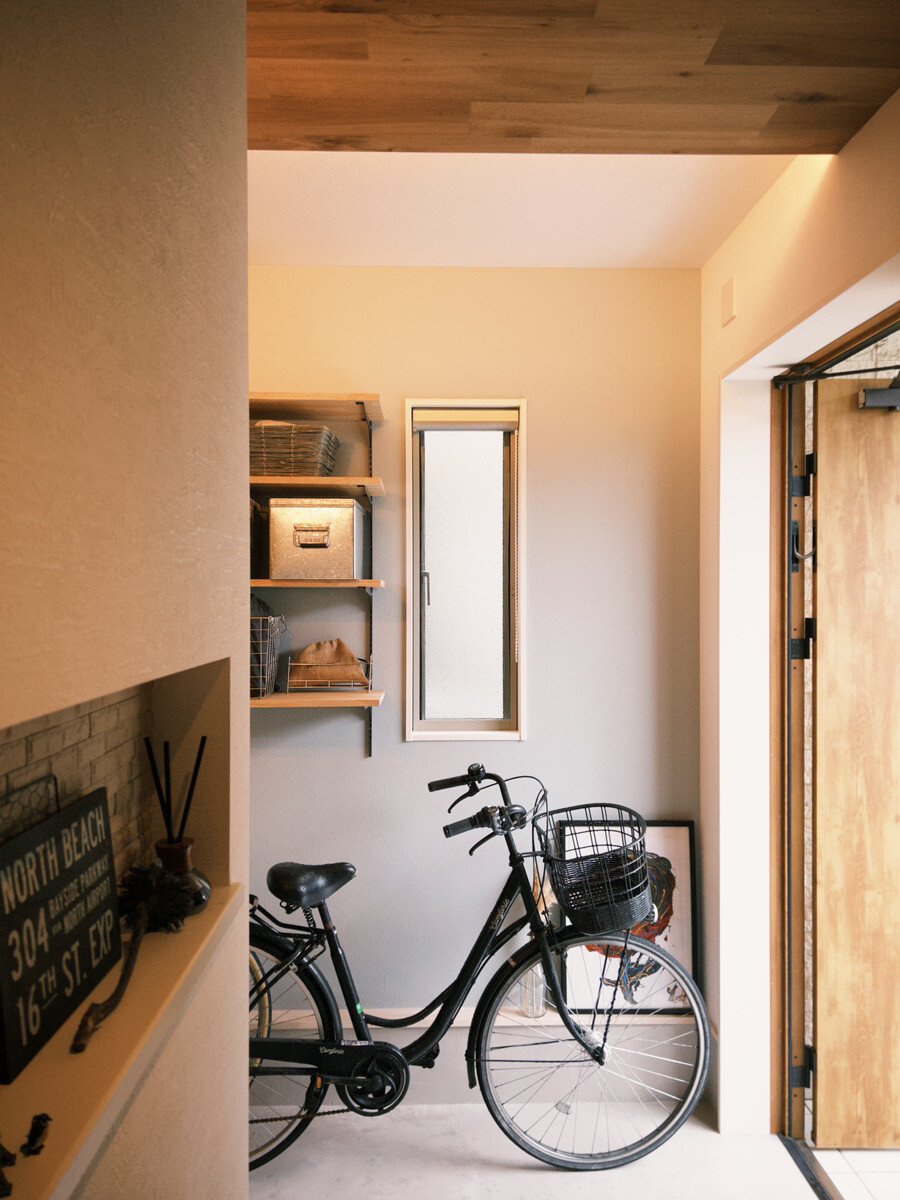 和室の一部を玄関に取り込み、収納や自転車のスペースを確保。