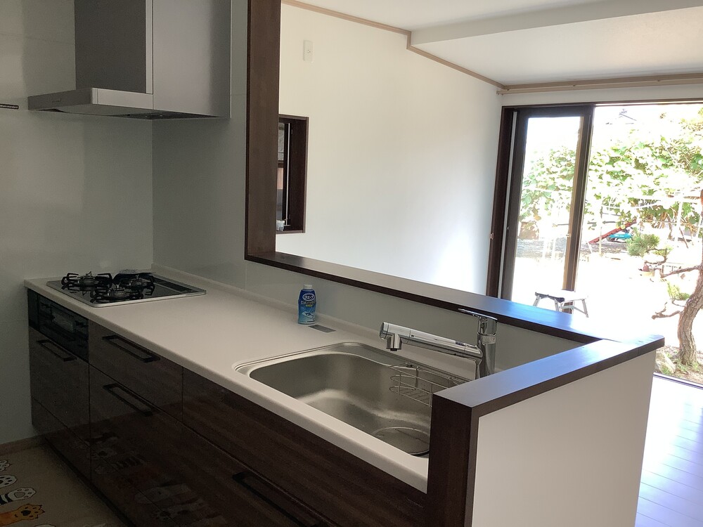 北側の窓に面したキッチンを南向きの対面型キッチンへ変更。照明を点けなくても明るく、