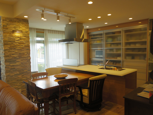 電動昇降を付けることで吊り戸棚をもっと使いやすく! 手前のテーブルを壁の形に合わせて製作することで、空間を広く活用可能に。